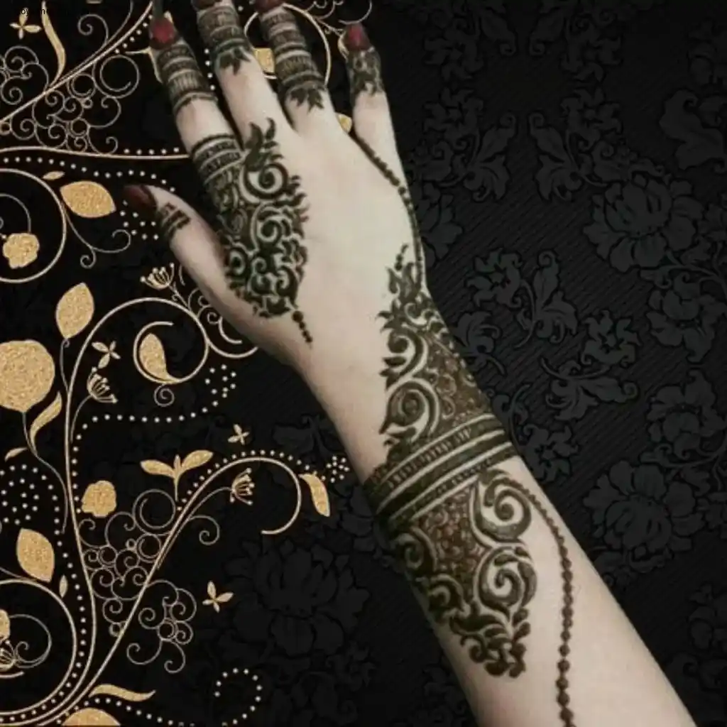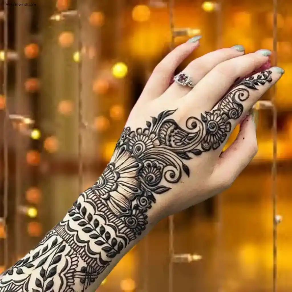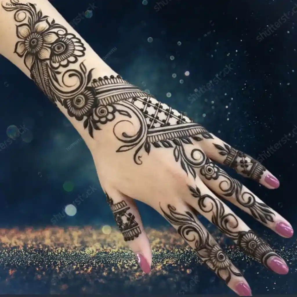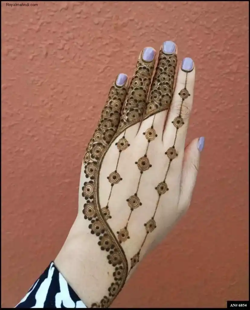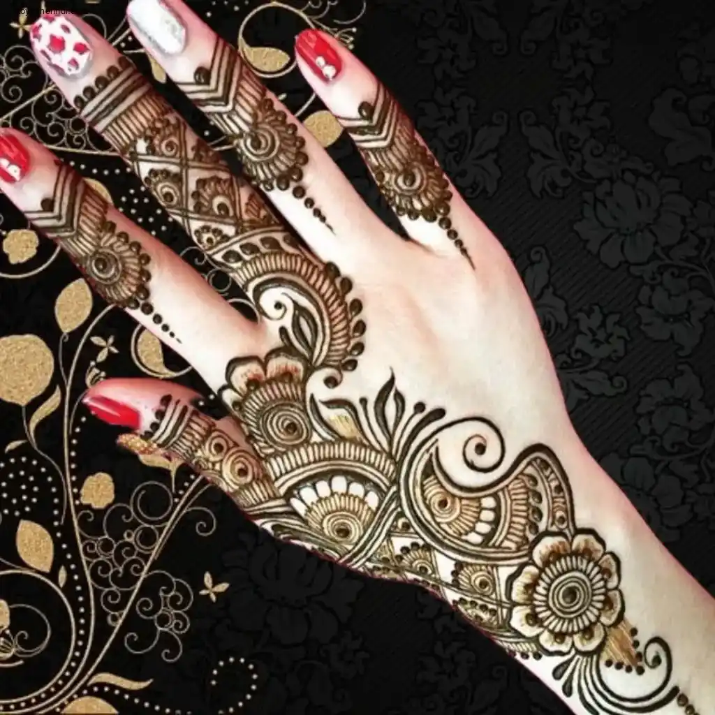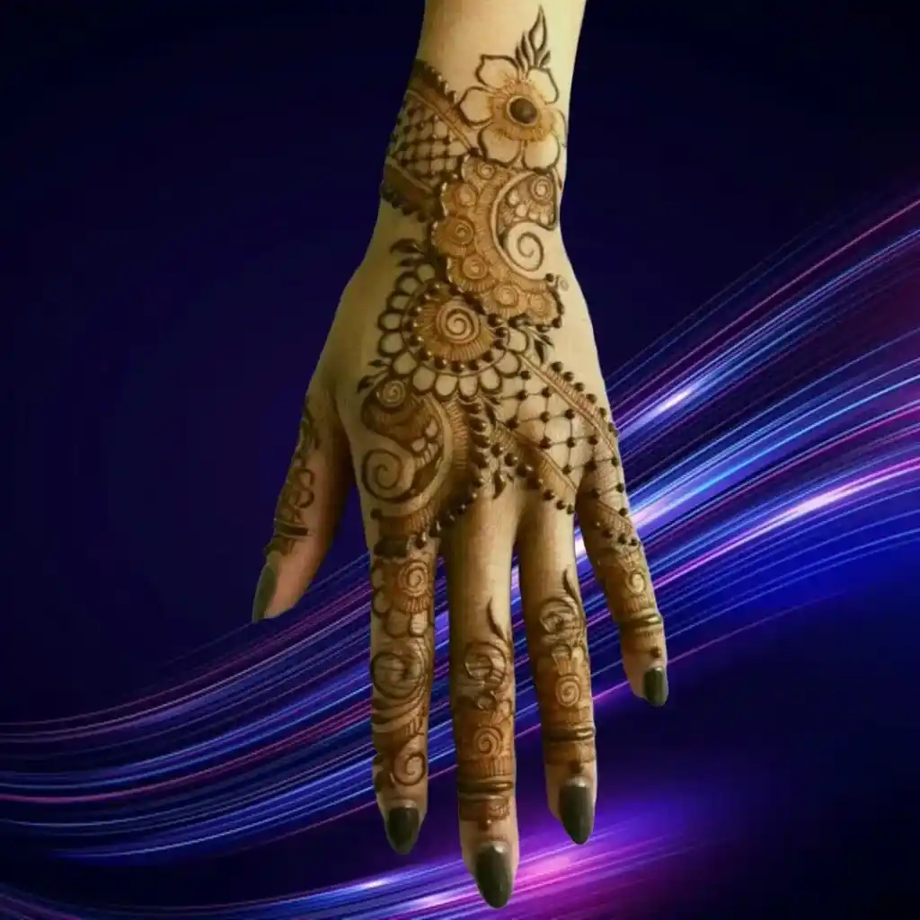 Many straight forward simple back hand Mehndi designs use negative space to create a modern flair giving them a refined and exquisite look. The fingers may have elaborate mesh designs, tiny leaves or tiny dots for detailing. Modern Mehndi designs understated style makes them perfect for festivals, bridal celebrations and informal events where a delicate yet sophisticated back hand Mehndi presentation is desired.