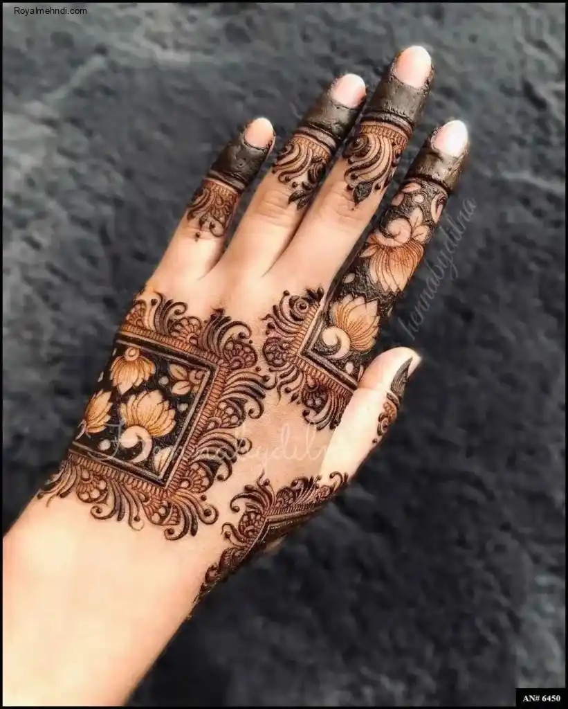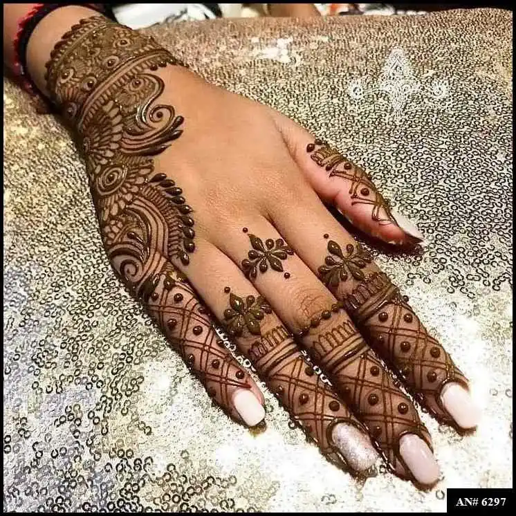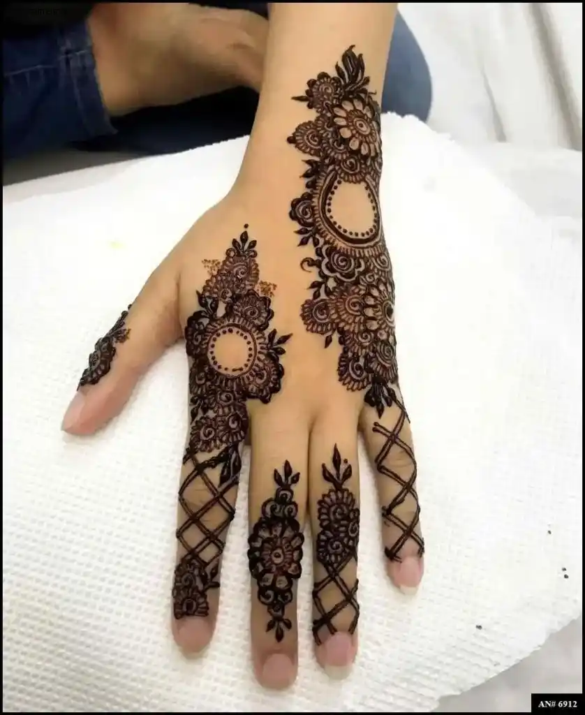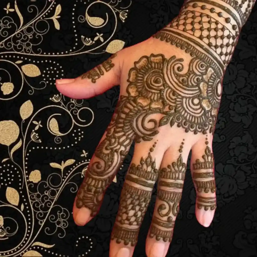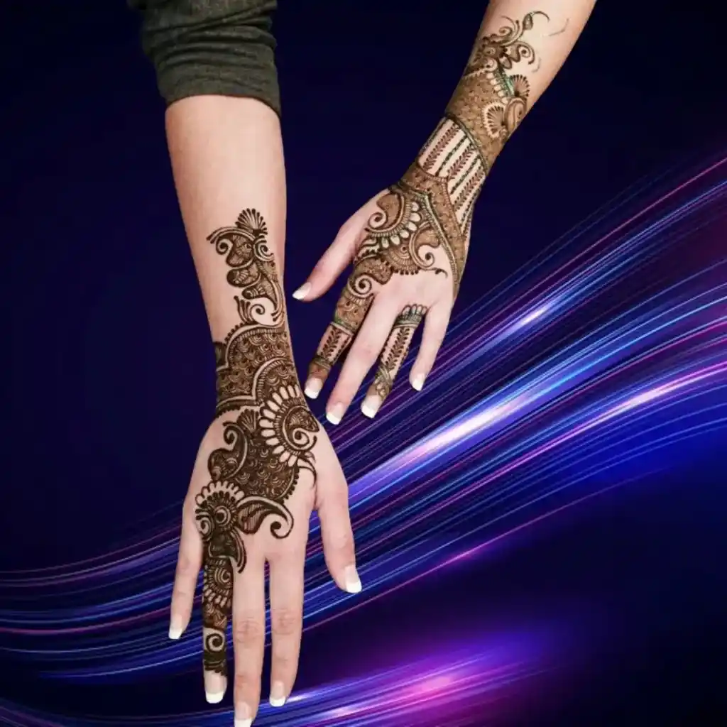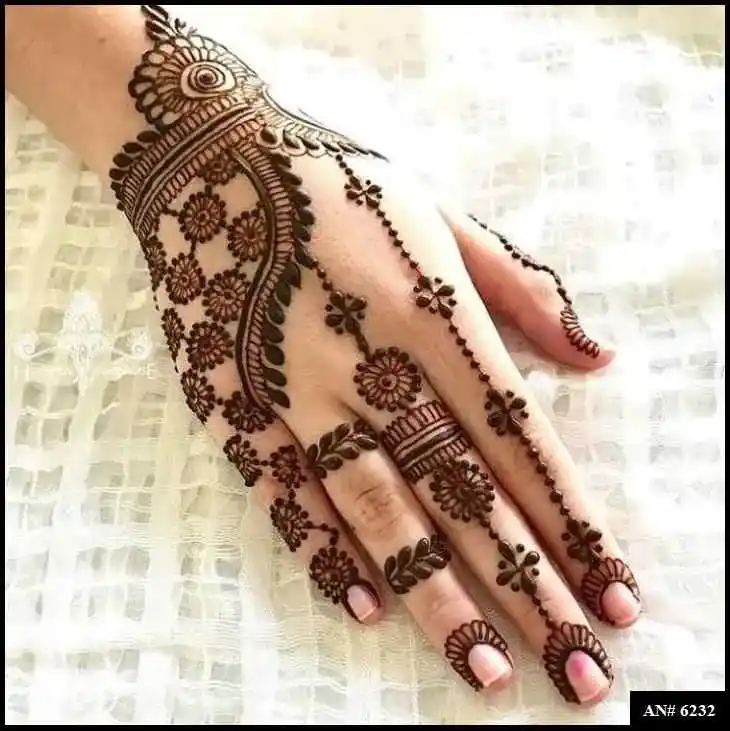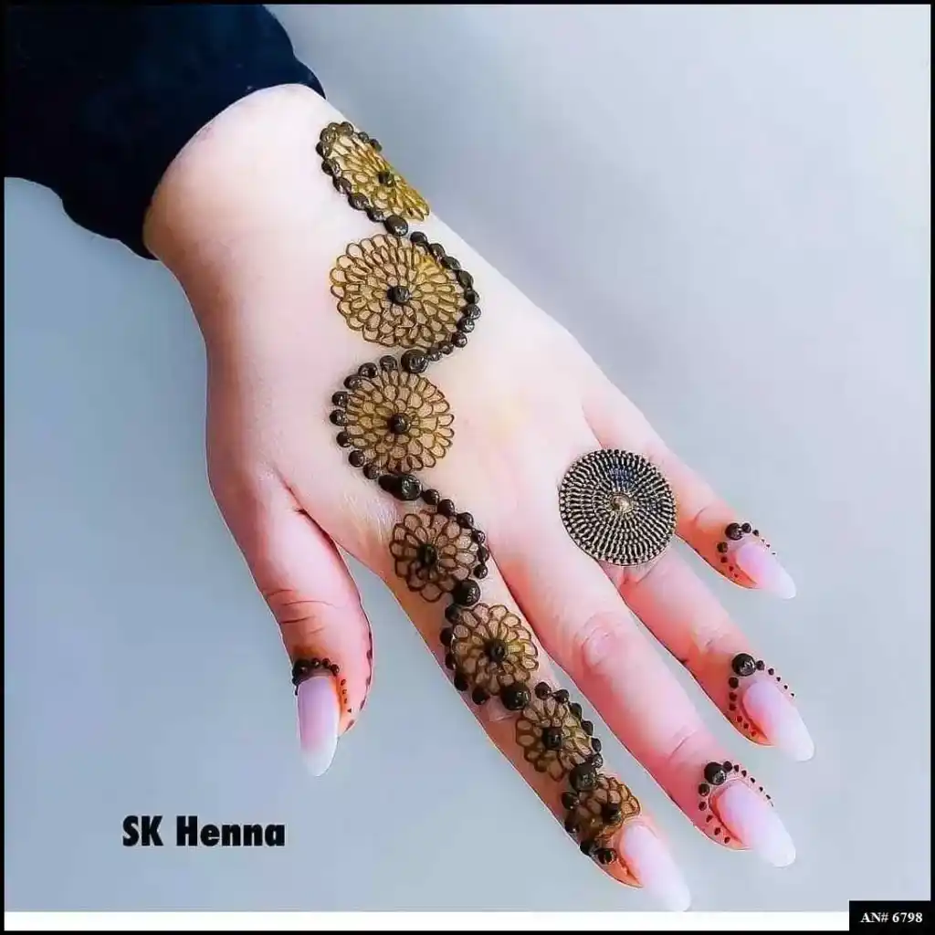Many straight forward simple back hand Mehndi designs use negative space to create a modern flair giving them a refined and exquisite look. The fingers may have elaborate mesh designs, tiny leaves or tiny dots for detailing. Modern Mehndi designs understated style makes them perfect for festivals, bridal celebrations and informal events where a delicate yet sophisticated back hand Mehndi presentation is desired.
