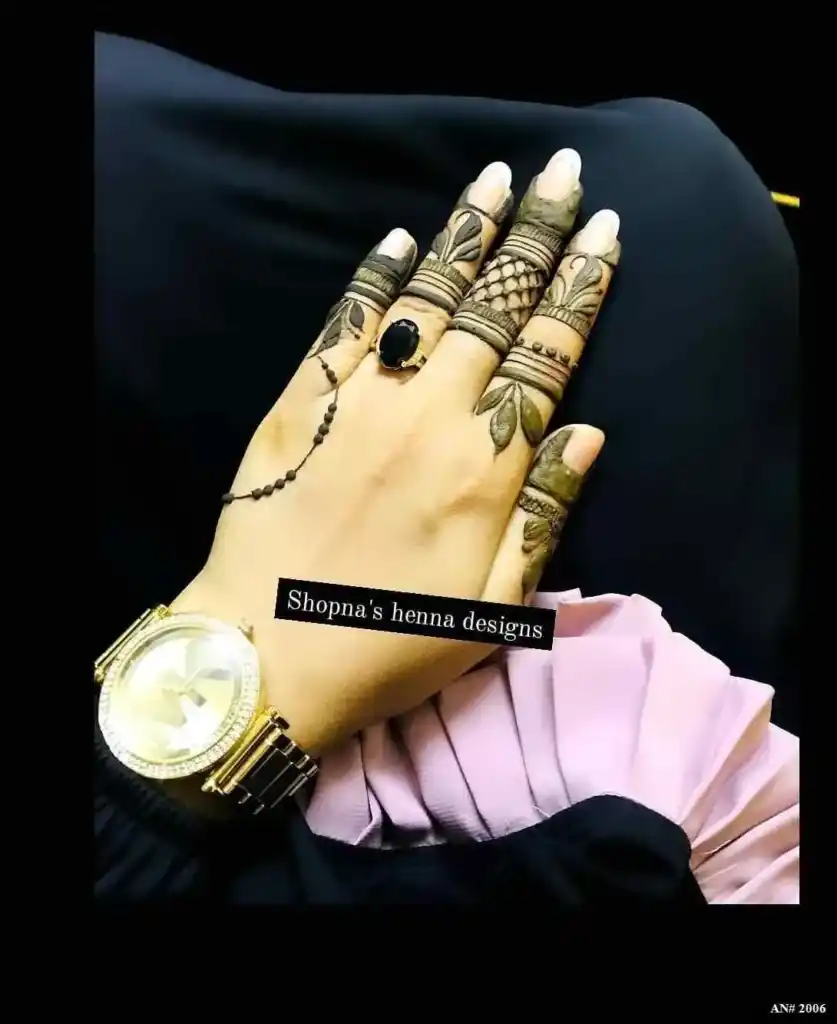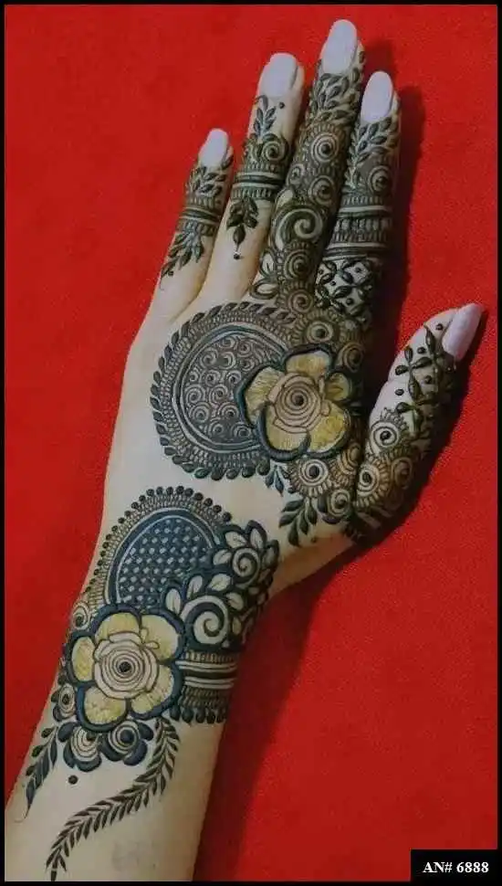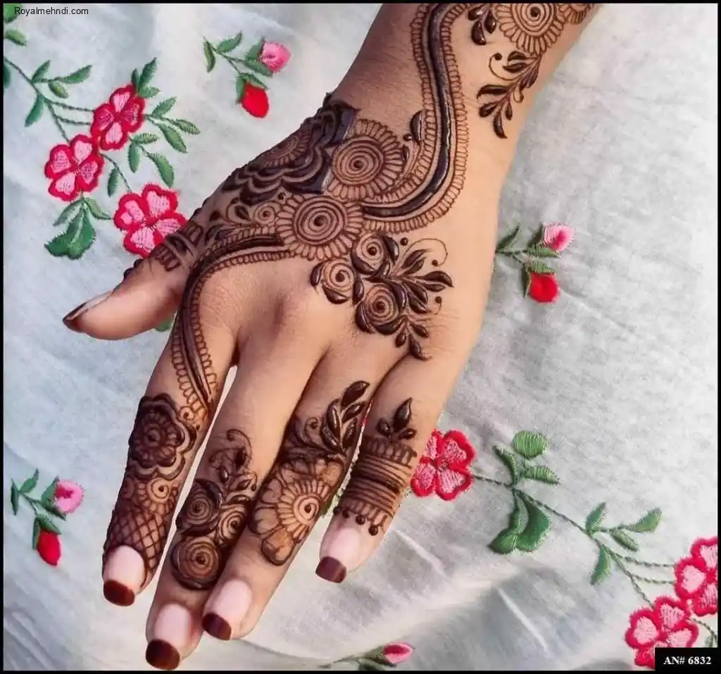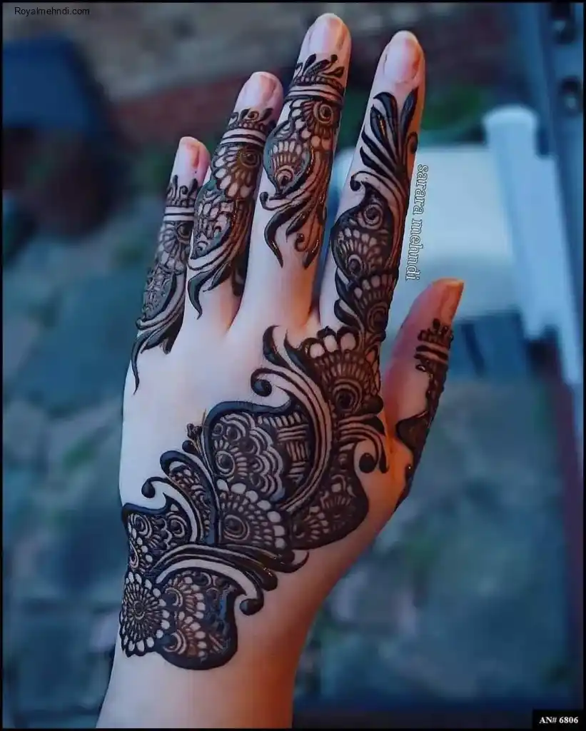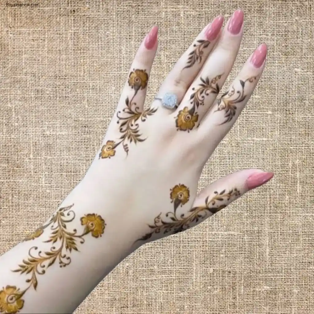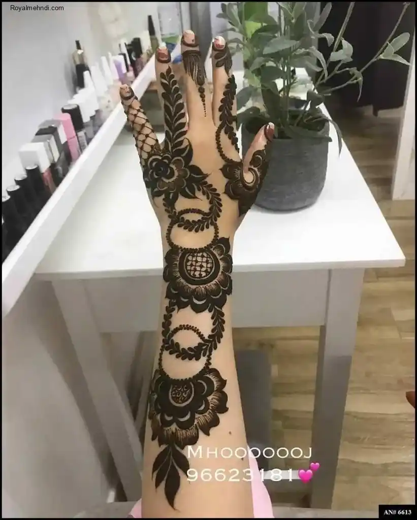 Many straight forward simple back hand Mehndi designs use negative space to create a modern flair giving them a refined and exquisite look. The fingers may have elaborate mesh designs, tiny leaves or tiny dots for detailing. Modern Mehndi designs understated style makes them perfect for festivals, bridal celebrations and informal events where a delicate yet sophisticated back hand Mehndi presentation is desired.