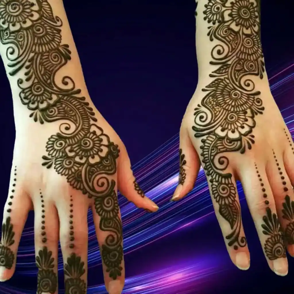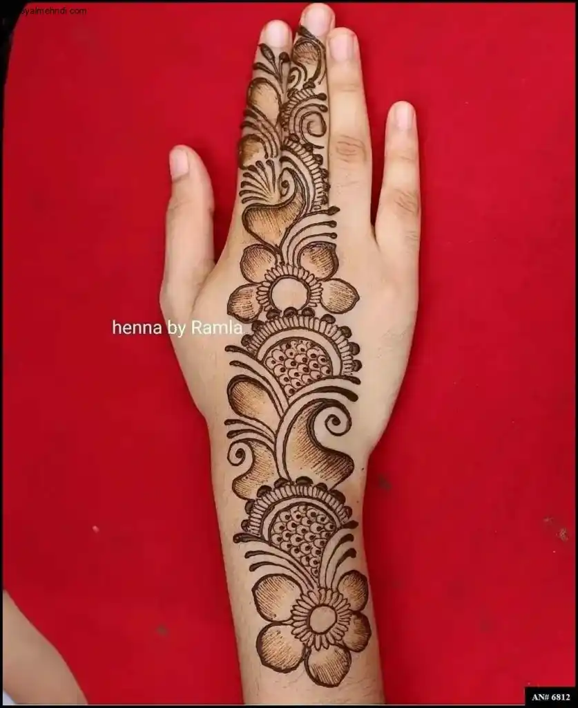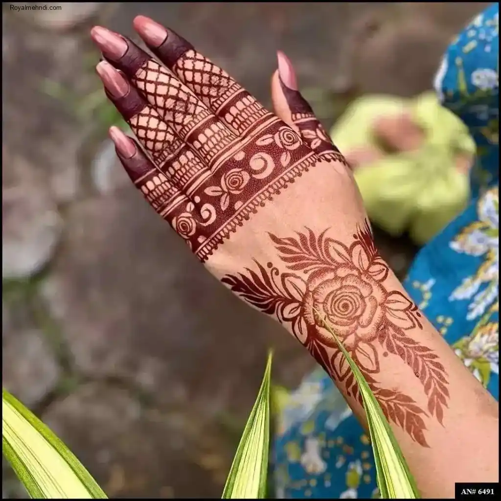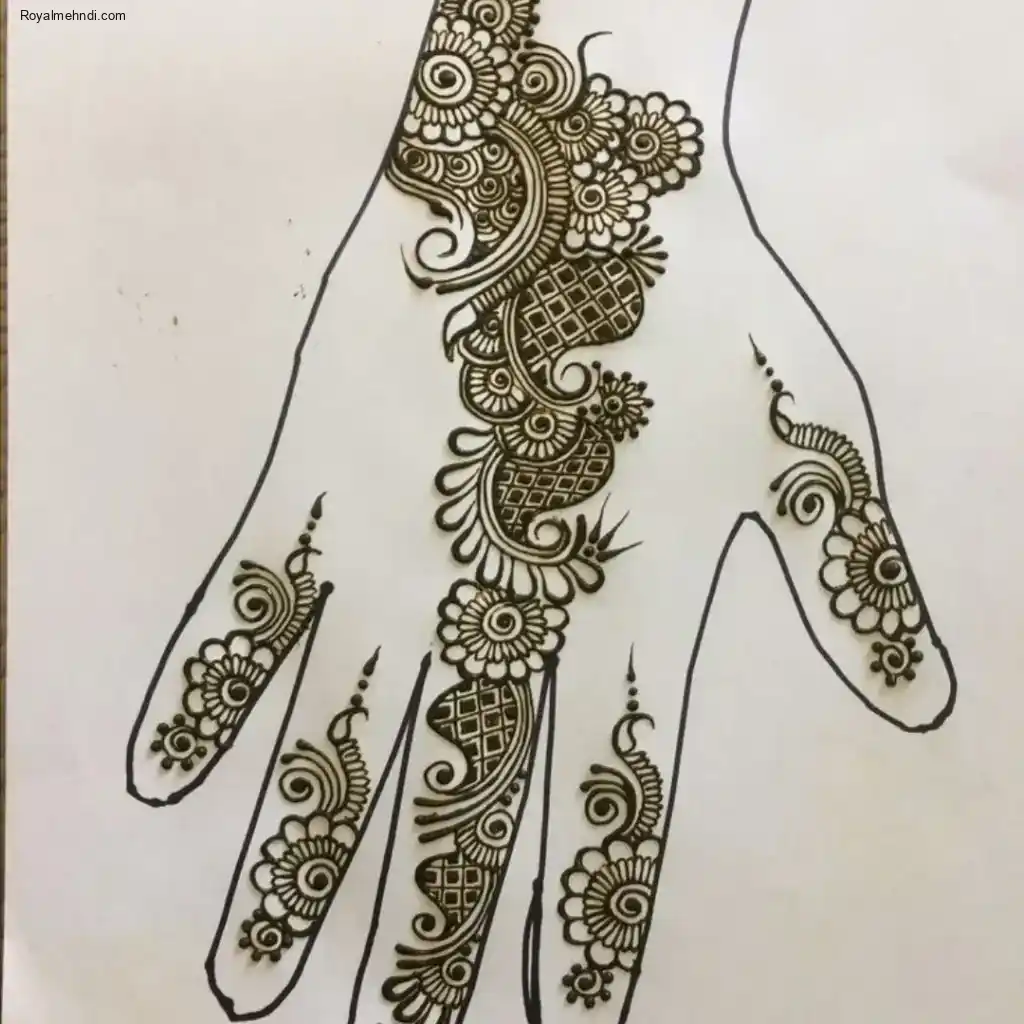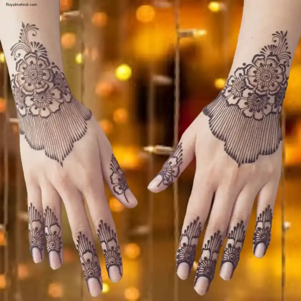 A Simple Back Hand mehndi designs have elegant simple patterns that add visual appeal. In general it consists of delicate vines, floral motifs, paisley patterns and geometric shapes that are balanced with a central mandala or floral motif on the back this royal back hand Mehndi design typically starts at the wrist and spreads to the fingers.
